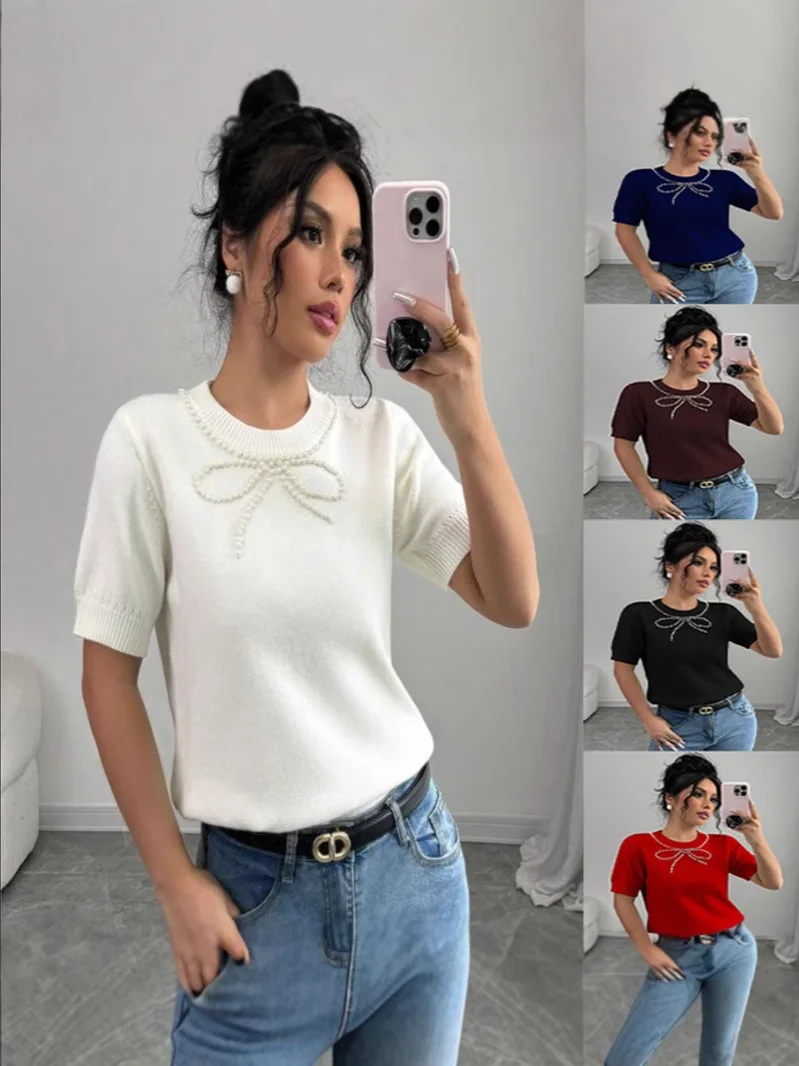 2025 Summer Top Eco-Friendly New Short-Sleeved Casual Knitted Top Solid Color Bow Rhinestone Slim Fit for Europe America